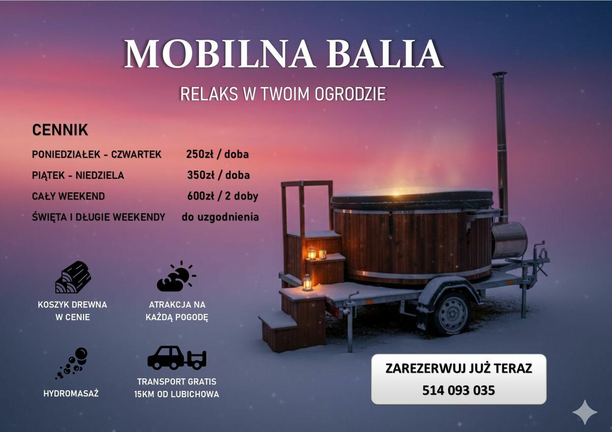 Sylwester 2025/26 - termin zajęty!Wynajmę NOWĄ mobilną balię - wannę z hydromasażem i piecem na drewno.